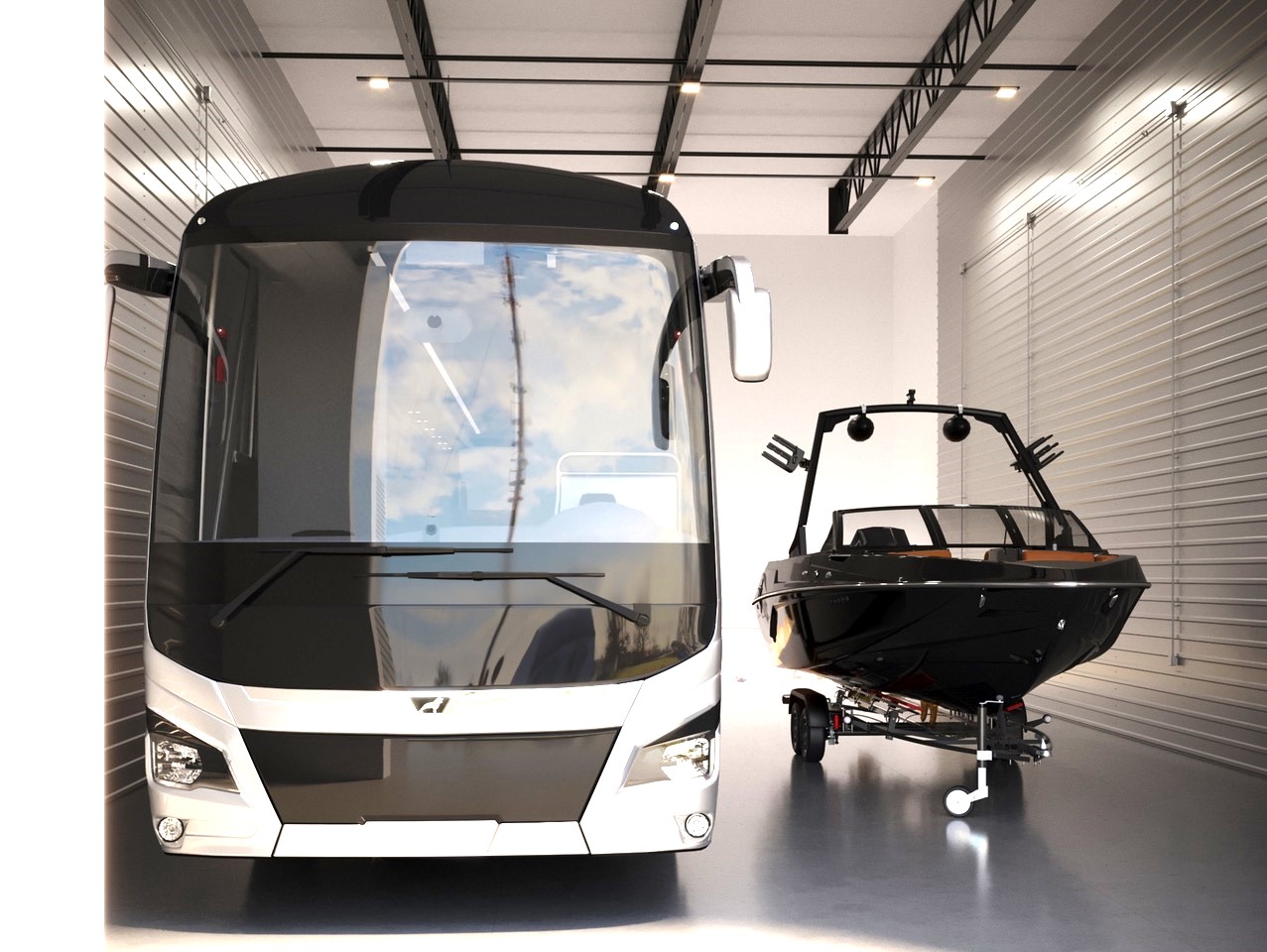 - Automated Oversized Doors: Motorized 14’ high x 16’ or 18’ wide doors with remote-control access—perfect for even the tallest trailerable boats and motorhomes.